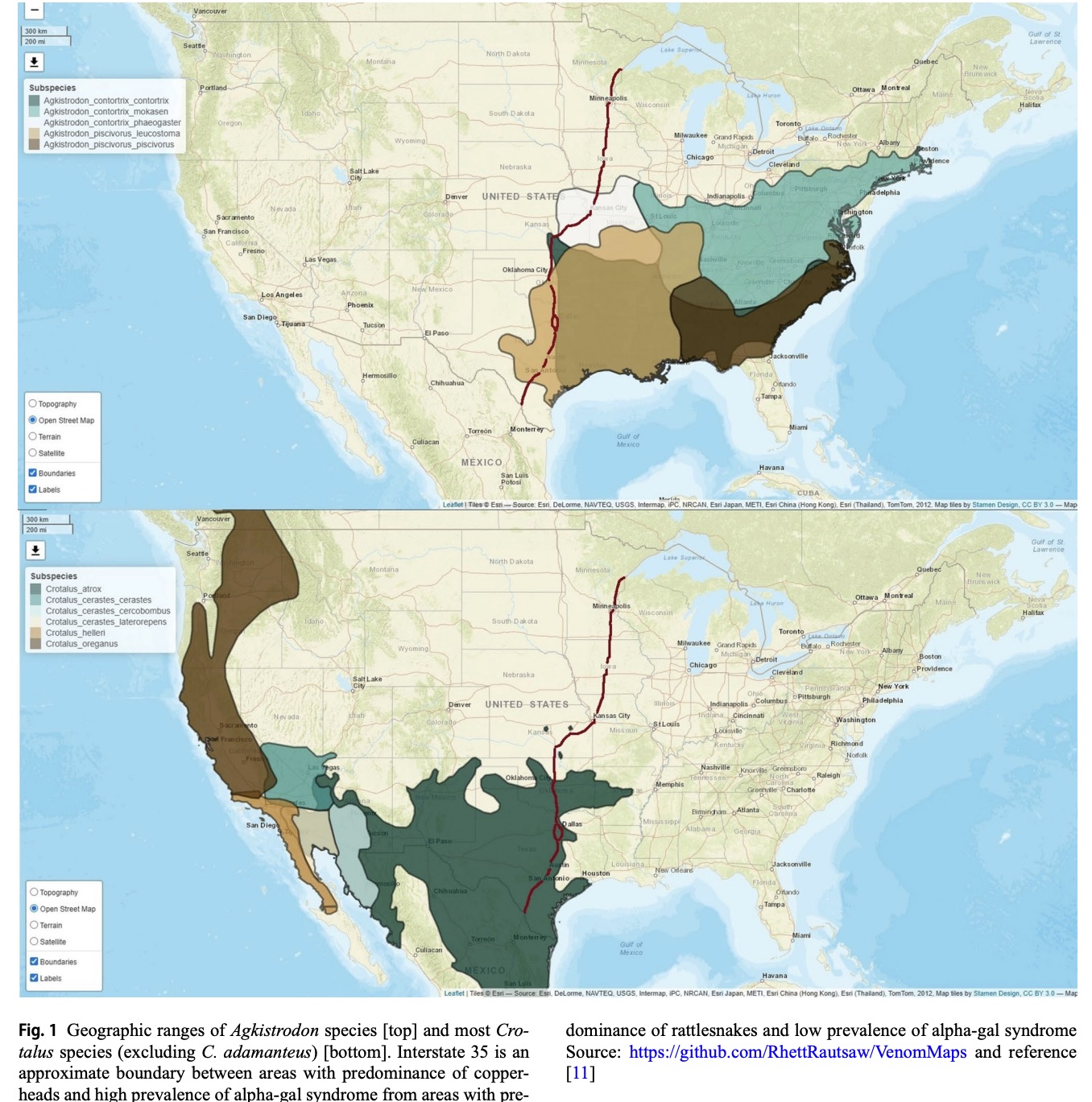 We suggest that Interstate 35 (I-35) is a reasonable and recognizable boundary. I-35 bisects the continental United States from Duluth, Minnesota to Laredo, Texas. I-35 roughly separates the geographic ranges of most copperheads and most rattlesnakes (Fig. 1) [11]. Considering these cost and safety factors, we suggest that if one is east of I-35 then one should probably use Fab and if one is west of I-35 then one should use F(ab’)2. This may work until snakes start driving on the wrong side of the road.